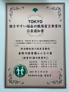 - ◆東京都福祉保健局より「TOKYO働きやすい福祉の職場宣言」の認定をいただきました!